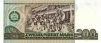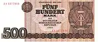 ![]() 200 Mark der DDR note, 1985 (front) ![]() 200 Mark der DDR note, 1985 (back) ![]() 500 Mark der DDR note, 1985 (front) ![]() 500 Mark der DDR note, 1985 (back) |
