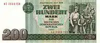 The Staatsbank der DDR (State Bank of the GDR) had planned to issue 200 and 500 Mark der DDR notes. The notes were printed in 1971 and in 1984 in preparation for issue, but were never circulated. A few examples are held by collectors. Unlike the lower-denomination notes, these notes did not have a personality on the obverse. The 200 Mark der DDR note had on its front a family with two children in front of a modern GDR high-rise apartment building. The back pictured a schoolyard with eight children and a teacher. The watermark was a dove of peace. On the 500 Mark der DDR note, the front showed the coat-of-arms of the GDR (hammer and a compass in a wreath), while the back showed the State Council (Staatsrat) building of the GDR in Berlin. | |
