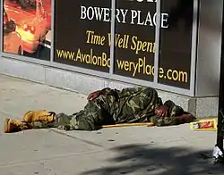The Bowery was once known for its many homeless shelters, drug rehabilitation centers and bars. The phrase "On the Bowery", which has since fallen into disuse, was a generic way to say one was down-and-out.[140] By the 21st century, the Bowery had become a boulevard with new luxury condominiums. Redevelopment of the avenue from flophouses to luxury condominiums has met resistance from long-term residents, who agree the neighborhood has improved but its unique, gritty character is disappearing.[141] The Bowery has also become an area with a diverse artistic community. It is the location of the Bowery Poetry Club, where artists Amiri Baraka and Taylor Mead have held regular readings and performances,[142] and until 2006 was home to the punk-rock nightclub CBGB.[143]