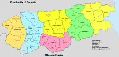 Eastern Rumelia consisted of the departments (called in Bulgarian окръзи okrazi, in Ottoman terminology sanjaks) of Plovdiv (Пловдив, Filibe), Tatarpazardzhik (Татарпазарджик, Tatarpazarcığı), Haskovo (Хасково, Hasköy), Stara Zagora (Стара Загора, Eski Zağra), Sliven (Сливен, İslimye) and Burgas (Бургас, Burgaz), in turn divided into 28 cantons (equivalent to Bulgarian околии okolii, Ottoman kazas).[8]