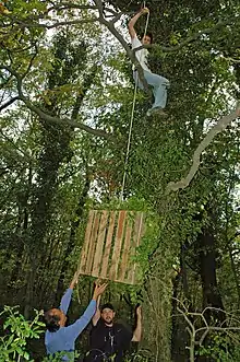The eastern imperial eagle is a fairly solitary bird, with rarely more than a pair occurring, although some small gatherings recorded at waterholes or food during migrant or winter. Pairs on the breeding grounds engage in aerial displays with loud calling and extensive high circling, which like most of accipitrids is likely for the purposes territorial proclamation to other eagles of their species. The display is often interspersed with mock dives and talon showing. One or both members of a pair may participate in the aerial display. If an interloper does not leave during the first part of the display, the territorial skirmish then may become physical and it sometimes leads to cartwheeling with interlocked talons, falling until they nearly hit the ground. Despite the fairly impressive display, it is generally of slightly shorter duration than the similar one done by golden eagles.[2][121] In East Thrace, Turkey, the mean nearest nest distance between actively breeding pairs was 10.44 km (6.49 mi).[75][122] In the Irkutsk Oblast near Lake Baikal, the mean distance of the central area of nests (each pair had more than one nest on territory) was 17 km (11 mi).[61] The breeding season lasts from late March to September throughout the range but in their former range in Pakistan (where it is now extirpated as a breeder) was said to extend from November to April.[2][123] The pair constructs a very large nest of sticks, which may average up to 1.2 to 1.5 m (3 ft 11 in to 4 ft 11 in) across and 60 to 70 cm (24 to 28 in) in depth. However, nests for the species have been recorded to measure up to 2.4 m (7 ft 10 in) or more across and 1.8 to 2 m (5 ft 11 in to 6 ft 7 in) deep. Nests can outmatch in size those even of larger species such as golden eagles.[2][17][61] Nests are frequently lined with various materials, including twigs, grass, fur, debris and greenery. Usually eastern imperial eagles build their nest in tall trees but recorded down to as low as 2 m (6.6 ft) in low scrub or, rarely, on cliff or ground (later as recorded in the Sayan mountains of Kazakhstan).[2] Nest sites have been found anywhere from in the depth of a forest to forest edge to a solitary tree that may be visible for miles in open plains.[17] Nesting sites in both Turkey and Georgia were consistently under 450 m (1,480 ft) elevation. In Georgia, denser mixed forests with openings were favored alternately with more arid, isolated stands of juniper (Juniperus ssp.) and pistachio (Pistacia vera); in Turkey, poplar (Populus ssp.) (44%) and oak (Quercus ssp.) (40%) were favored.[76][122] In extensive Russian studies, 78% of nests were in conifers when compared with Kazakhstan where deciduous trees are more prevalent, however in the latter country conifers are still used where they are found.[37] Unusual nest sites in agricultural land of Slovakia include one next to a railroad and another next to a busy road.[124] The eastern imperial eagle has also been recorded as nesting on electric poles and towers in Russia and Kazakhstan. In several cases they aggressively took over the nests from steppe eagles that were previously nesting on the electric towers.[125][126][127] Often one nest is used but sometimes a 2nd or 3rd is constructed by the imperial eagle pair may exist on a home range.[2][17][61]