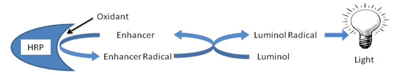 Eclox ECL is a broadband enhanced chemiluminescence (ECL) assay that can be used to qualitatively assess a water sample to determine whether it has been contaminated. ECL reactions are used in a number of clinical and analytical applications and are based upon the oxidation of luminol in the presence of the enzyme horseradish peroxidase (HRP), an oxygen source, and an enhancer such as 4-iodophenol.[4]