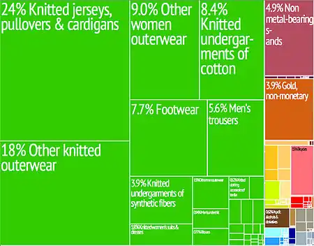 The garment industry represents the largest portion of Cambodia's manufacturing sector, accounting for 80% of the country's exports. In 2012, the exports grew to $4.61 billion up 8% over 2011. In the first half of 2013, the garment industry reported exports worth $1.56 billion.[27] The sector employs 335,400 workers, of which 91% are female.