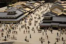 The Edo-Tokyo Museum (江戸東京博物館, Edo Tōkyō Hakubutsukan) is a historical museum located at 1-4-1 Yokoami, Sumida-Ku, Tokyo in the Ryogoku district.[2] The museum opened in March 1993 to preserve Edo's cultural heritage, and features city models of Edo and Tokyo between 1590 (just prior to the Edo period beginning) and 1964.[3] It was the first museum built dedicated to the history of Tokyo.[4] Some main features of the permanent exhibitions are the life-size replica of the Nihonbashi, which was the bridge leading into Edo; scale models of towns and buildings across the Edo Meiji, and Showa periods; and the Nakamuraza theatre.[5]