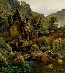 From 1829 to 1836, he attended the Kunstakademie Düsseldorf and studied with the landscape painter, Johann Wilhelm Schirmer from 1832 to 1833.[1] His first landscapes depicted the regions of Hunsrück and Eifel and received excellent marks. In 1836, he and several other students left the Kunstakademie, due to conflicts with its conservative Director, Friedrich Wilhelm Schadow.
