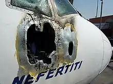 ![]() The nose of EgyptAir's Boeing 777 Nefertiti after the fire | |