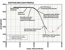 The cockpit voice recorder (CVR) recorded the captain excusing himself to go to the lavatory, followed 30 seconds later by the first officer saying in Egyptian Arabic "Tawkalt ala Allah," which can be translated as "I put my trust in God." A minute later, the autopilot was disengaged, immediately followed by the first officer again saying, "I rely on God." Three seconds later, the throttles for both engines were reduced to idle, and both elevators were moved 3° nose down. The first officer repeated "I rely on God" seven more times before the captain suddenly asked repeatedly, "What's happening, what's happening?" The flight data recorder (FDR) reflected that the elevators then moved into a split condition, with the left elevator up and the right elevator down, a condition that is expected to result when the two control columns are subjected to at least 50 lb (23 kg) of opposing force.[1] At this point, both engines were shut down by moving the start levers from run to cutoff. The captain asked, "What is this? What is this? Did you shut the engines?" The captain is then recorded as saying, "get away in the engines" (this is the literal translation that appears in the NTSB transcript), followed by "shut the engines". The first officer replies "It's shut". The final recorded words are the captain repeatedly stating, "Pull with me" but the FDR data indicated that the elevator surfaces remained in a split condition (with the left surface commanding nose up and the right surface commanding nose down) until the FDR and CVR stopped recording. No other aircraft were in the area, and no indication was given that an explosion occurred on board. The engines operated normally for the entire flight until they were shut down. From the presence of a western debris field about 1,200 ft (370 m) from the eastern debris field, the NTSB concluded that the left engine and some small pieces of wreckage separated from the aircraft before water impact.[1]