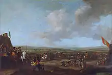 In November 1573, Fadrique laid siege to Leiden. Spanish troops meanwhile defeated a mercenary force led by Orange's brothers Louis and Henry of Nassau-Dillenburg in the Mookerheyde.[34] In May 1574, the polders surrounding Leiden were flooded and a Sea Beggar fleet managed to lift the siege on 2 October 1574.[35] Alba was replaced as regent by Requesens. In the summer of 1575, Requesens ordered Cristobal de Mondragon to attack the Zeeland city of Zierikzee, which surrendered on 2 July 1576; however, the Spanish troops mutinied and left Zierikzee. Philip had not been able to pay his troops for two years.[36]