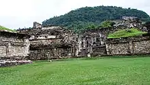 The site is located in Mexico in the highlands of the municipality of Papantla in modern-day Veracruz, not far from the city of Poza Rica, which lies northwest of the port and city of Veracruz. The city is set in the low rolling mountains that lead from the Sierra Madre Oriental to the Gulf coast near the Tecolutla River.[11] In ancient times, this city was located in the northeast corner of what is called Mesoamerica,[12] and controlled an area from between the Cazones and Tecolutla Rivers to the modern state of Puebla.[13] The main city is defined by two streams which merge to form the Tlahuanapa Arroyo, a tributary of the Tecolutla River.[12] These two streams provided the population's potable water. Most of the buildings are at the southern end, where the land is relatively flat and the two streams converge. The site extends to the northwest where terraces were constructed to place more buildings, mostly for the city's elite. However the city also had communities located on the hills east and west of the main city, with mostly lower-class dwellings.[11] Total site extends for 1,056 hectares (4.08 sq mi).[14]