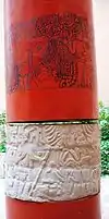 The site museum is divided into two parts: an enclosed building and a roofed area covering large stone sculpture fragments. The enclosed room is for smaller objects that have been found during the years the site has been explored, most coming from the Pyramid of the Niches. One of the most interesting objects on display is an altar from Building 4. It is a large stone slab sculpted to depict four individuals standing in pairs with a figure of intertwined snakes between the two pairs. The snakes represent the ball game marker called the tlaxmalacatle in Aztec times. The main exhibits of the roofed area are the fragments recovered from the Building of the Columns, with a number partially reassembled. One tells the story of 13 Rabbit, a ruler of El Tajin who probably had the building constructed. The scene shows as dual procession with 13 Rabbit seated on a wooden throne and his feet on a severed head. In front is a sacrifice victim with his entrails slung over a frame. 13 Rabbit's name glyph appears above as well as an attendant named 4 Axe. The rest of the procession consists of warriors holding captives by their hair.[33]