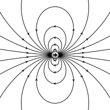 Theoretically, an electric dipole is defined by the first-order term of the multipole expansion; it consists of two equal and opposite charges that are infinitesimally close together, although real dipoles have separated charge.[1] However, when making measurements at a distance much larger than the charge separation, the dipole gives a good approximation of the actual electric field. The dipole is represented by a vector from the negative charge towards the positive charge.