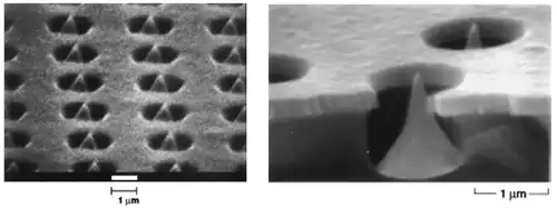 AFN and BFN are the constants determined by measurements of the FEA with units of A/V2 and V/m, respectively. EFN is the electric field that exists between the electron emissive tip and the positively biased structure drawing the electrons out. Typical constants for Spindt type cathodes include: AFN = 3.14 x 10-8 A/V2 and BFN = 771 V/m. (Stanford Research Institute data sheet). An accelerating structure is typically placed in close proximity with the emitting material as in the below figure.[44] Close (micrometer scale) proximity between the emitter and gate, combined with natural or artificial focusing structures, efficiently provide the high field strengths required for emission with relatively low applied voltage and power. The following figure below displays close up visual images of a Spindt emitter.[45][46][47]