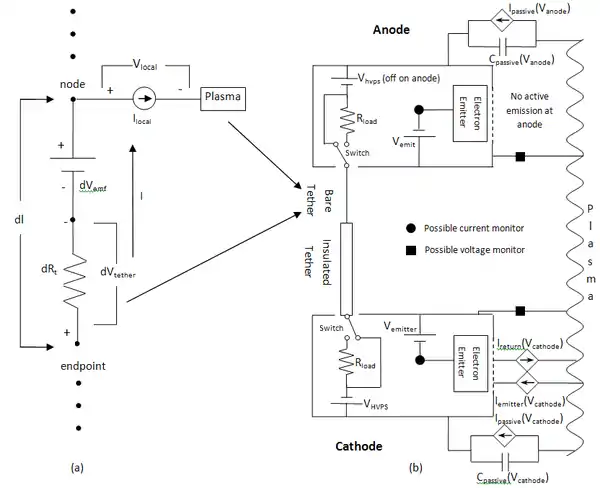 An electrodynamic tether can be described as a type of thermodynamically "open system". Electrodynamic tether circuits cannot be completed by simply using another wire, since another tether will develop a similar voltage. Fortunately, the Earth's magnetosphere is not "empty", and, in near-Earth regions (especially near the Earth's atmosphere) there exist highly electrically conductive plasmas which are kept partially ionized by solar radiation or other radiant energy. The electron and ion density varies according to various factors, such as the location, altitude, season, sunspot cycle, and contamination levels. It is known that a positively charged bare conductor can readily remove free electrons out of the plasma. Thus, to complete the electrical circuit, a sufficiently large area of uninsulated conductor is needed at the upper, positively charged end of the tether, thereby permitting current to flow through the tether.