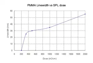 - A 20 nm resolution had also been demonstrated using a 3 nm 100 keV electron beam and PMMA resist.[32] 20 nm unexposed gaps between exposed lines showed inadvertent exposure by secondary electrons.