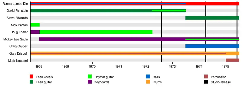 - Ronnie James Dio – lead vocals (1967–1975), bass (1967-1973; died 2010)