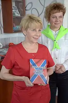 Her organisation was also active in providing medical supplies, equipment and food to hospitals in Donetsk and Luhansk, however Glinka complained that the customs checks for their convoys of trucks were slow and onerous and delayed delivery of the supplies.[12][13] Despite NATO's claims that Russia was supplying heavy weapons and regular troops to the pro-Russian separatists in Ukraine, Glinka said that she didn't see Russian troops in Donetsk and that there was a civil war going on.[14][15] She also delivered medication to the Ukrainian pilot Nadiya Savchenko during her hunger strike while imprisoned in Russia.[16]