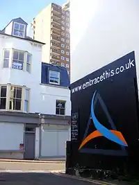 The marketing and promotion strategy for the film comprised a direct mail campaign in Sussex, which directed people to the Embrace Life website, which at the time only had a countdown clock and the Embrace Life logo (which represents a stylised seat belt). This generated interest on Twitter and other social networking sites. A poster/flyer campaign in Sussex followed, and the campaign was picked up by the local media in Sussex. At the same time, a council-sanctioned graffiti campaign was undertaken around Brighton and Hove, with Embrace Life logos (some up to 20 feet high) and the Embrace This website address painted by graffiti artist Aroe and his team.[3][15] (The Embrace Life website address had already been taken, and so was not available. Embrace This was chosen as the alternative.) At the same time a public space art gallery was set up in a disused shop in Horsham. The existing web front page – at that time just the countdown clock and the logo – was shown on a large plasma screen along with props from the film and stills. These were all designed to give nothing away, to heighten curiosity about the campaign. Children were encouraged to interact by drawing a picture of what made them feel safe, and then to add it to the wall. By the end of the installation, the walls were covered with children's drawings, and visitors and participants were given a flier with the campaign's web address.[16]