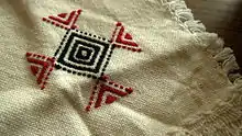 A variation of Kutch work, this geometric embroidery starts with a foundation framework of herringbone stitch[16][17] or Cretan stitch, and then this framework is completely filled with interlacing. It is said that this technique originated in far away land of Armenia and found its way to Gujarat by travelling Nomads. Sindhi stitch or Maltese cross stitch is also similar but the innovation of the Kutchi women have taken it beyond the traditional designs... Kutch work[18]