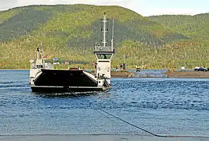 The Englishtown Ferry is a cable ferry carrying Nova Scotia Route 312 across the mouth of St. Ann's Bay. The ferry route runs 24 hours a day, on demand, and takes only a few minutes to cross the 125-metre-wide (410 ft) channel.[1] On 25 March 2013, an 81-year-old man was killed after driving his car off the end of the ferry during boarding and plunging into the cold, swiftly-moving waters.[2]