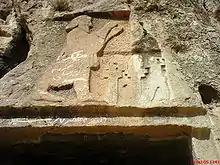 The Essaqwand Rock Tombs (Persian: گوردخمه اسحاقوند) are three rock-hewn tombs located 25 km southwest of Harsin in Kermanshah Province, Iran. On top of the middle tomb there is a rock relief of a man with his profile toward the viewers. He is holding his hands in prayers in front of him. There is also a torch and a fire altar in front of him. Behind the fire altar there is another man, holding up something in his hands. The tombs have been attributed to different historical eras including Medes, Achaemenids, Seleucids and Parthians.[1]