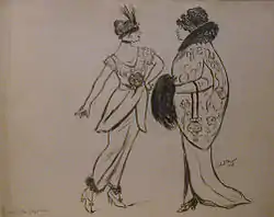 On her family's return to New York, Ethel recalled: "We lived in many places, some uptown, some downtown. Always making sketches and having exhibitions, but no home. Finally we took two rooms on West Thirty-Seventh Street in the Garment District, the top floor. The back studio hall room was Jerome’s studio and the third floor front hall room was where we three ate and slept. At this point I decided to be a designer of clothes. I took five dollars and bought lace and designed a blouse. Went up to the Fifth Avenue shop and sold the design. From then on I was in business."[5] "The year before the Armory show. Jerome back in Carnegie. I took an apartment on East 58th Street. Went in business designing and had three girls. Worked for Fifth Avenue trade."[5] "Mrs. Myers was a designer of women’s clothes and hats, maintaining a shop in New York City from 1920 to 1940 and designing clothes for noted celebrities of society, stage, and opera and for manufacturers."[1]