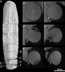 CT scanning shows that these openings lead to canals that connect to the trigeminal nerve, which controls facial sensitivity. The forward-directed canal also splits into the three main branches of the infraorbital nerve,[11] all of which connect to the socket of the canine; the junction occurs about 3–6 millimetres (0.12–0.24 in) along the canal, another point of variation between the two skulls. The top branch, the external nasal ramus, splits into four branches in the type skull, but it does not split in the second skull. In other therapsids like Thrinaxodon, Bauria, and Olivierosuchus, the external nasal ramus generally splits into three or more branches. All of these canals would have brought nerves and nutrient-rich tissue to the root of the canines and the rest of the upper jaw.[2][11]