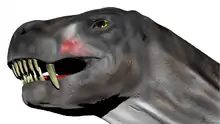 The type specimen preserves the right canine.[2] Like other therocephalians, the canine of Euchambersia was very large, resulting in a specialized predatory lifestyle that incorporates a sabertooth bite into prey killing.[6] It is round in cross-section,[3] and bears a prominent ridge on the side of its front surface. Immediately beside this ridge is a shallow depression that becomes wider near the top of the tooth, which is probably the same structure as the groove interpreted by some authors.[2][7] Theriodonts usually replace their teeth in an alternating[8] (or distichial) pattern,[9][10] such that the canine tooth is always functional; both skulls of Euchambersia show no sign of any replacement teeth developing, suggesting that Euchambersia was reliant on having both canines present and functional simultaneously.[2]