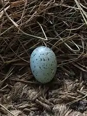 In Europe, clutches are typically laid in April,[27] and usually contain five or six eggs, but clutches with as few as three and as many as ten have been recorded.[28] The eggs are laid in early morning, usually at daily intervals.[29] On average, the eggs of the nominate species measure 32.9 mm × 23 mm (1.30 in × 0.91 in) and weigh 9.9 g (0.35 oz).[29][30] Small for the size of the bird, they are typically pale blue-green, with close specks and spots of olive brown, but show much variation in ground and marking.[31]