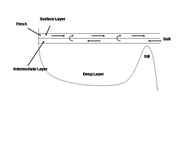 Stratified waters, in combination with slow vertical mixing, are essential to maintaining euxinic conditions.[1] Stratification occurs when two or more water masses with different densities occupy the same basin. While the less dense surface water can exchange gas with the oxygen-rich atmosphere, the denser bottom waters maintain low oxygen content. In the modern oceans, thermohaline circulation and upwelling prevent the oceans from maintaining anoxic bottom waters. In a silled basin, the stable stratified layers only allow surface water to flow out of the basin while the deep water remains anoxic and relatively unmixed. During an intrusion of dense saltwater however, the nutrient-rich bottom water upwells, causing increased productivity in the surface, further enhancing the nutrient trap due to biological pumping. Rising sea level can exacerbate this process by increasing the amount of deep water entering a silled basin and enhancing estuarine circulation.[15][16]