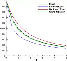 with the initial condition Consider a grid for 0 ≤ k ≤ n, that is, the time step is and denote for each . Discretize this equation using the simplest explicit and implicit methods, which are the forward Euler and backward Euler methods (see numerical ordinary differential equations) and compare the obtained schemes.