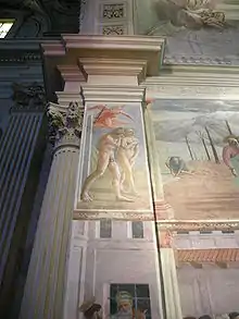 Three centuries after the fresco was painted, Cosimo III de' Medici, in line with contemporary ideas of decorum, ordered that fig leaves be added to conceal the genitals of the figures. These were eventually removed in the 1980s when the painting was fully restored and cleaned.[1]