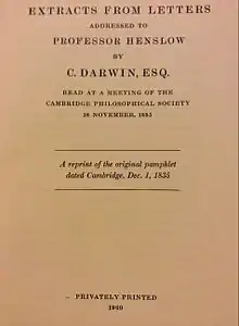 Extracts from Letters to Henslow is an 1835 pamphlet published by John Stevens Henslow at his own expense of extracts from ten letters Charles Darwin sent him while on HMS Beagle. This pamphlet helped to establish Darwin's reputation amongst renowned scientific publications. However, upon learning of this pamphlet's publication Darwin was "a good deal horrified" at Henslow making public "what had been written without care or accuracy".[1]