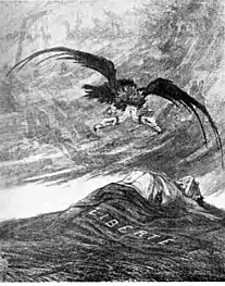 Les Sataniques (The Satanic) was a series of his own initiative, independent of his book illustrations and literary works. Dating from about 1882, there are a number of closely related drawings, watercolors, sketches, and other mixed media pieces, as well as prints in various states of development. He had hoped to do a large series and eventually publish them in the form of a book, but this never came to fruition. Ultimately a set of five heliogravures (based on five original drawings) were published, including: Satan semant l'ivraie (Satan Sowing Tare), L'enlèvement (The Abduction), Le Calvaire (The Calvary), L'idole (The Idol), and Le Sacrifice (The Sacrifice). The frontispiece of the cycle, Satan Sowing Tare, which appeared in several versions, was based on the Biblical Parable of the Tares which appears in Matthew 13:24-13:30. This series ranks among the more familiar and discussed images of his work. There is nothing in the dozens of references below to suggest that Rops was actively involved or a believer in Satanism, and his use of this subject was only symbolic or metaphoric.[1]:243 p.[8]