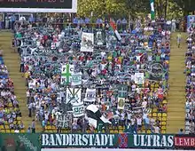 Just before being appointed a director of the Moscow studio of Deutsche Welle,[24] German journalist Markus Reher wrote an article in which he claimed that Ukraine is not ready to hold an event such as 2012 UEFA Euro, because there are too many "nationalist thugs" and neo-Nazis, particularly referring to Karpaty supporters. In the article an interviewed Karpaty supporter claims that supporters of the club "don't start fights" and are "just giving their team support". The supporter went on to say that "everything'll be fine" if supporters of other clubs don't provoke him or other supporters of Karpaty Lviv, and if they had foreign players at the club, they would send them back home if they could. The article claimed that the club protects its players from its nationalist fans, and Danilo Avelar, a player from Brazil, stated that he "hasn't heard of nationalist fans and hopes it isn't true". The article goes on to report that authorities have had problems in the past with violent fans in Lviv, citing a riot in Lviv's old town when ultranationalist Karpaty supporters clashed with supporters of German side Borussia Dortmund with injuries on both sides.[25] Another British correspondent Manuel Veth, who in an article the NKVD troops who fought against the Ukrainian Insurgent Army as "Soviet anti-terrorist forces", also considers the Karpaty Lviv supporters as nationalist radicals.[26]
