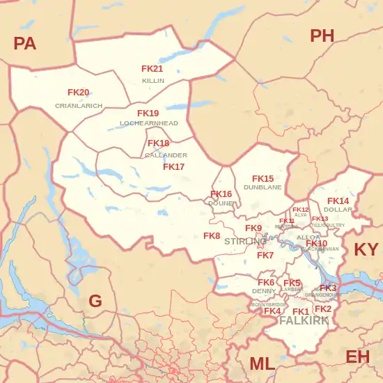 The FK postcode area, also known as the Falkirk postcode area,[2] is a group of 21 postcode districts in central Scotland, within 18 post towns. These cover most of the Falkirk council area (including Falkirk itself, Grangemouth, Larbert, Denny and Bonnybridge), most of the Stirling council area (including Stirling itself, Dunblane, Doune, Callander, Lochearnhead, Crianlarich and Killin) and Clackmannanshire (including Alloa, Clackmannan, Menstrie, Alva, Tillicoultry and Dollar), plus small parts of Fife, Perth and Kinross, and Argyll and Bute.
