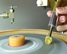 The head is then grossly adjusted for height so that the rough is just touching the lap when it is lowered into position. The machine is turned on so the lap begins to spin. The drip tank spigot is opened and adjusted so that about one drip falls per second onto the lap, and the drip is made to fall near the center of the lap so the water will be carried outward by centrifugal force and cover the whole lap. The quill is carefully lowered to the lap and contact is made. This is a grinding lap, so it is very coarse, and the sound is something like a running faucet. Gentle pressure is applied and the mineral is ground away until the quill reaches the desired angle. The quill is lifted and the facet is inspected.