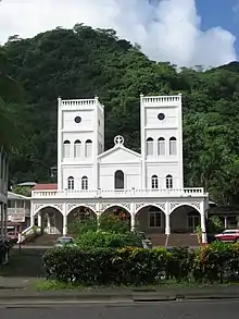 Fagatogo contains the Pago Pago port, the Pago Pago bus station and market, and the Co-Cathedral of St. Joseph the Worker of the Roman Catholic Diocese of Samoa-Pago Pago.[10] Fagatogo is also home to the governor's mansion, which sits on a hilltop just west of the Rainmaker Hotel, in a section of Fagatogo called Utulei. This colonial mansion was built in 1903, during the naval administration. The 1917 Jean P. Haydon Museum is located a little further west. The old jail (built in 1911) and the police station sit just across the field from the Fono.[11] The architecture includes both 19th century clapboard buildings and newer, two-story, monotone concrete structures.[12]