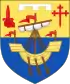 The badge of office is A stag lodged reguardant Gules, gorged of a coronet of four fleur-de-lys (two visible) and four crosses pattee (one and two halves visible) Or.[2]