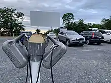 Family Drive-In is open seven days a week from June to August, on the weekends in the spring and fall, and closed during the winter months. The 7.5 acres (3.0 ha) theater includes two screens playing first-run films, though older movies are sometimes played on one of the screens.[1][3][4] The first screen is able to accommodate 240 cars while the smaller second screen, added in 1989, can accommodate 144.[3][2] The double feature policy allows customers to pay one admission price and watch two-first run films. Retro music is played before the films begin and a playground is available for children. Customers are able to hear the film's audio by choosing between drive-in speakers on 4 feet (1.2 m) high poles or their car radio.[1] According to Kopp, the speakers and poles are difficult to maintain since only one manufacturer still makes spare parts for them. When asked if he would ever remove them, Kopp said "Heck no. These classic speakers are part of the drive-in theater experience."[3] A concession stand staffed by "cast members" sells various refreshments, including pizza from a local restaurant and GoPicnic, a healthier option requested by some customers.[3]