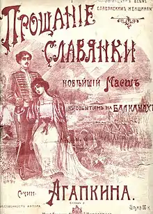 "Farewell of Slavianka" (Russian: Прощание славянки – Proshchaniye slavyanki) is a Russian patriotic march, written by the composer Vasily Agapkin in honour of the Slavic women accompanying their husbands in the First Balkan War.[1] The march was written and premiered in Tambov in the end of 1912. In summer of 1915 it was released as a gramophone single in Kiev. Slavyanka means "Slavic woman".