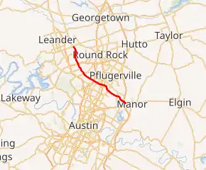 The southern terminus of FM 734 is at US 290, just west of Manor in Travis county. From there, it travels northwest to intersect with Interstate 35, continues to Loop 1, crosses SH-45 (and RM 620) in Northwest Austin, then proceeds north to its northern terminus at RM 1431 in Cedar Park.