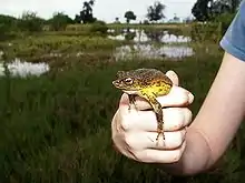 Puerto Rico's herpetofauna consists of 25 amphibian species and 61 reptile species. The majority of West Indian terrestrial reptile clade is believed to have arrived by flotsam dispersion from South America. Little evidence exists to support the alternative hypothesis of proto-Antillean vicariance.[27] Other terrestrial herpetofauna are believed to have arrived to the West Indies (and Puerto Rico) by the same method and subsequently undergone vicarization by banks or islands.[28] As a result, Puerto Rico, and the Caribbean in general, has one of the highest percentages of endemism among amphibians and reptiles in the world. Amphibian species in Puerto Rico belong to four families: Bufonidae (2 species), Hylidae (3), Leptodactylidae (18) and Ranidae (2). Reptiles include turtles (freshwater and marine), lizards, worm lizards, snakes and a caiman.