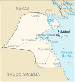 ![]() A Lithuanian map of Faylaka Island with it highlighted, in relation to mainland Kuwait and neighboring countries. | |