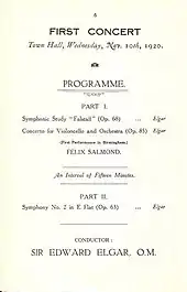 On 10 November 1920, the inaugural concert of the City of Birmingham Orchestra (later the City of Birmingham Symphony Orchestra) was given at Birmingham Town Hall, with Elgar conducting a concert of his own works,[7] including the first performance of his Cello Concerto in that city, with Salmond as the soloist.