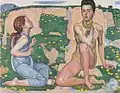 Hodler developed a style he called "parallelism" that emphasized the symmetry and rhythm he believed formed the basis of human society.[3] In paintings such as The Chosen One (1893), groupings of figures are symmetrically arranged in poses suggestive of ritual or dance. Hodler conceived of woman as the embodiment of the desire for harmony with nature, while a child or youth represented innocence and vitality.[10] In Eurythmy (1895), the theme of death is represented by a row of five men in ceremonial robes walking in an ordered procession on a path strewn with fallen leaves.[11]