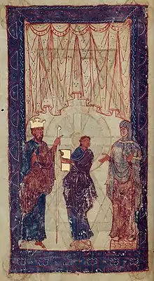 ![]() Ferdinand (left) and his wife Sancha (right) receive a book of hours from its scribe. From an illumination in a contemporary book of hours. | |