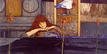 In 1889, Khnopff laid his first contacts with England, where he would stay and exhibit regularly in the future. British artists such as Hunt, Watts, Rossetti, Brown and Burne-Jones would become friends.[3] From 1895 Khnopff worked as a correspondent for the British art journal The Studio. Until the outbreak of World War I in 1914 Khnopff would be responsible for the rubric "Studio-Talks-Brussels" in which he reported about the artistic evolutions in Belgium and continental Europe. In March 1898 Khnopff presented a selection of 21 works on the first exhibition of the Vienna Secession. In Vienna his work was received with massive admiration.[4] The works he presented at the Secession would form a major influence on the oeuvre of Gustav Klimt.[4]