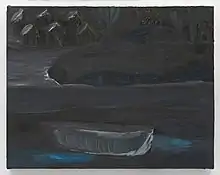 Ghebreyesus was an eclectic artist whose paintings showed varied influences.[9] He worked mostly in acrylic on canvas, but used oil on canvas early in his career.[16] Critics saw the early work as more somber than his later work and date the change from his marriage to Elizabeth Alexander in 1997.[1][17] His early paintings are often thickly painted nighttime scenes with a single source of illumination.[17] "Boat at Night," shown at left, is an example of his style at this stage in his career. Another early work, Dream Poem I, shown at right, shows his use of muted colors in an abstract design.