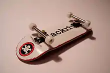 A fingerboard is a working replica (about 1:8 scaled) of a skateboard that a person "rides" by replicating skateboarding maneuvers with their fingers. The device itself is a scaled-down skateboard with graphics, trucks and moving wheels.[1] A fingerboard is typically 100 millimeters (3.9 in) long with width ranging from 26 to 36 mm (1.0 to 1.4 in). Professional skateboarder Lance Mountain is widely credited for the first fingerboard, and his skit in Powell-Peralta's "Future Primitive" video brought fingerboarding to the skateboarders of the world in the mid-1980s. Around the same time, Mountain wrote an article on how to make fingerboards in TransWorld SKATEboarding magazine.[1]