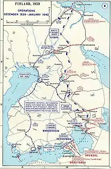 The Winter War was fought in three stages: the initial Soviet advance, a short lull and then a renewed Soviet offensive.[9] The war was fought mainly in three areas. The Karelian Isthmus and the area of Lake Ladoga was the primary focus of the Soviet war effort. A two-pronged attack, with one pincer engaging the Finnish forces on the Isthmus while the other went around Lake Ladoga in an attempt at encircling the defenders. This force was then to advance to and capture the city of Viipuri. The second front was in central Karelia, where the Soviet forces were to advance to the city of Oulu, cutting the country in half. Finally, a southwards drive from the north was to capture the Petsamo region.[10] By late December, the two main fronts had come to a standstill as the Finns were counterattacking with more strength and the Soviets were being bogged down. With the failure of two of its three offensives by the end of December, the Soviet headquarters ordered a cessation of operations. By 27 December it was observed that the Soviet forces were digging in on the Karelian Isthmus.[11] In the north, however, the Finns had been pushed back to Nautsi and with reinforcements took the higher ground to halt the Soviet advance south of Petsamo. During this period the Finns are known to have been harassing supply columns and even carrying out raids against fortified Soviet positions.[12] A lull period followed in January 1940, as the Soviet army reassessed its strategy, rearmed and resupplied.[13] The last phase began in February 1940 with a major artillery barrage that began on the 2nd and lasted till the 11th, accompanied by reconnaissance raids at key objectives.[14] The Soviets, using new equipment and materials, also began using tactics of rotating troops from the reserve to the front, constantly applying pressure to the Finnish defenders.[15] It seemed that the Red Army had inexhaustible amounts of ammunition and supplies, as attacks were always preceded by barrages, followed by aerial assaults and then random troop movements against the lines. Finnish military and government leaders saw that the only thing left to do was to negotiate a peace treaty with Moscow.[16]
